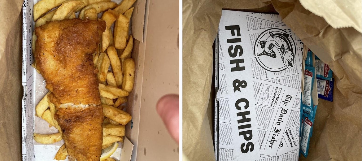 Absolutely perfect fish and chips. Excellent value large cod and chips. Beautiful and crispy batter and lovely chips. However does not need the lettuce, adds nothing to the dish.